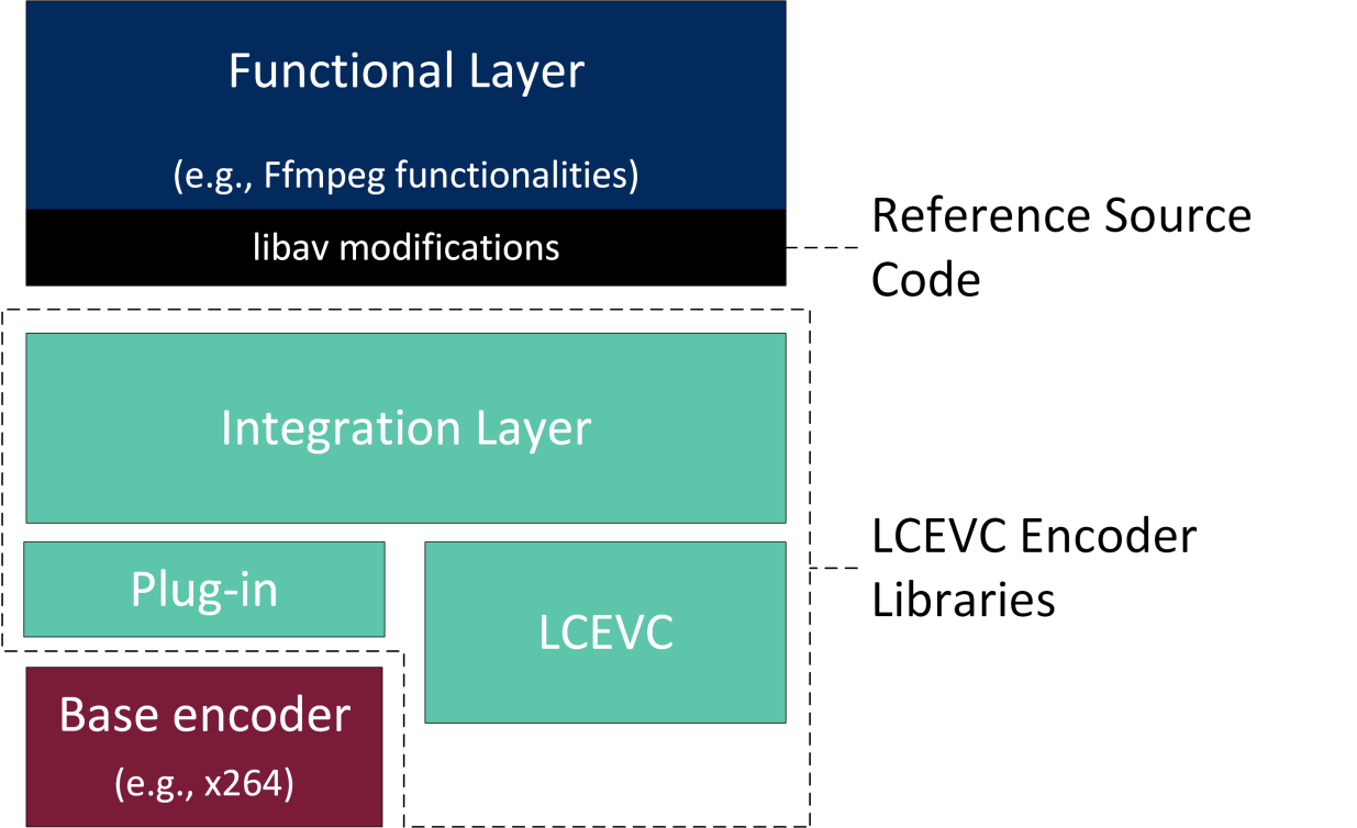 As a platform, FFmpeg can combine the V-Nova LCEVC encoder with other codec implementations supported by the V-Nova plug-in system, as illustrated in Figure 1.2. This single set of libraries is currently available with support for h.264 and HEVC codecs. Supported base encoders include x264 and x265 as well as many others (e.g. NVEnc, QSV, Xilinx NGCodec, and more). Please contact V-Nova through the Download Portal or via [email protected] to request a full list of supported base encoder implementations.
