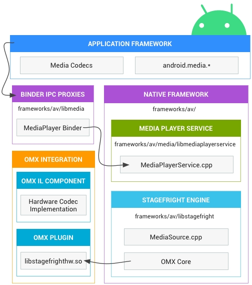 This page summarizes the steps for using MPEG-5 LCEVC with the Android Open-Source Project (AOSP). Android provides a well-defined framework for media applications to interact with the system at an operating system level, outlined in the diagram below. The Stagefright media playback engine incudes built-in software-based codecs for popular media formats at a native level. Stagefright audio and video playback features include integration with OpenMAX (OMX) codecs, session management, time-synchronized rendering, transport control and DRM. More information is available in the Android Media framework documentation.