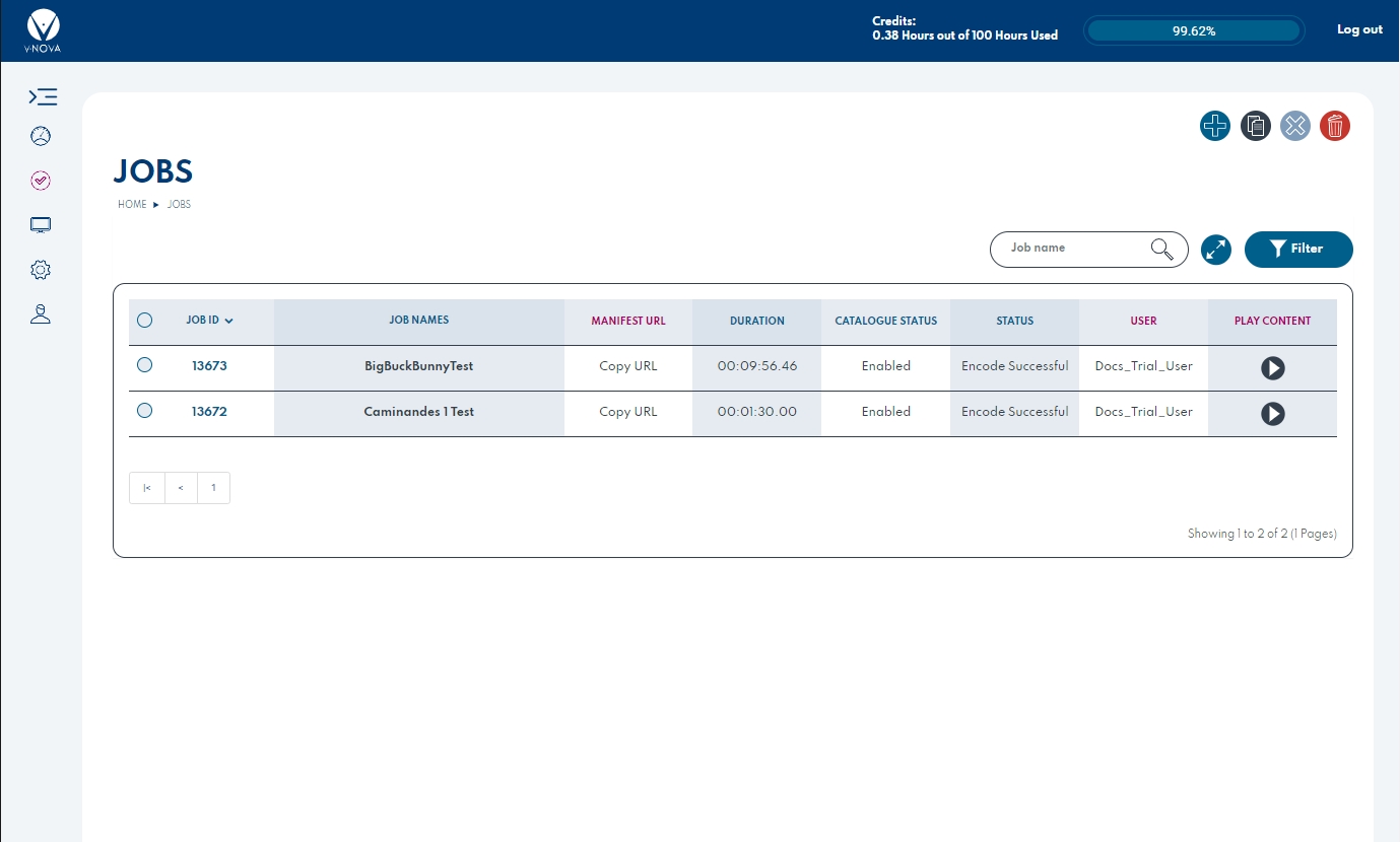 Once encoding is complete, then the Job ID, Job Names, Content ID, Manifest URL, Duration, , Catalogue Status, Status and Source are displayed on the Job List, accessed via Encode Jobs --> VOD page.