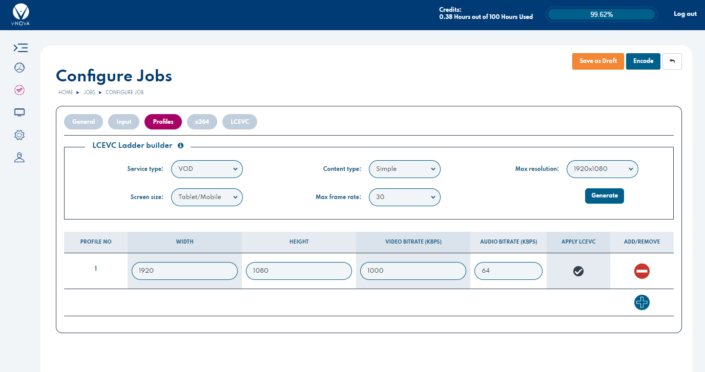 The Profiles tab is the place to define the encoding resolution & bitrate or CRF target, or use the LCEVC Ladder builder provided. Width, Height, Video bitrate or CRF and Audio Bitrate are mandatory fields.