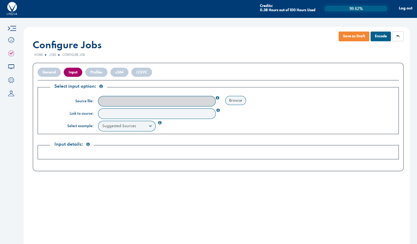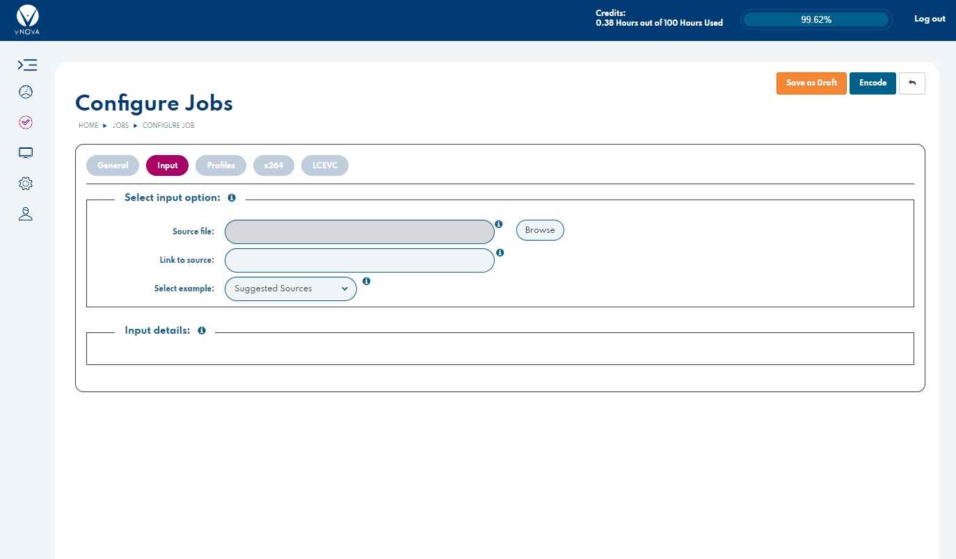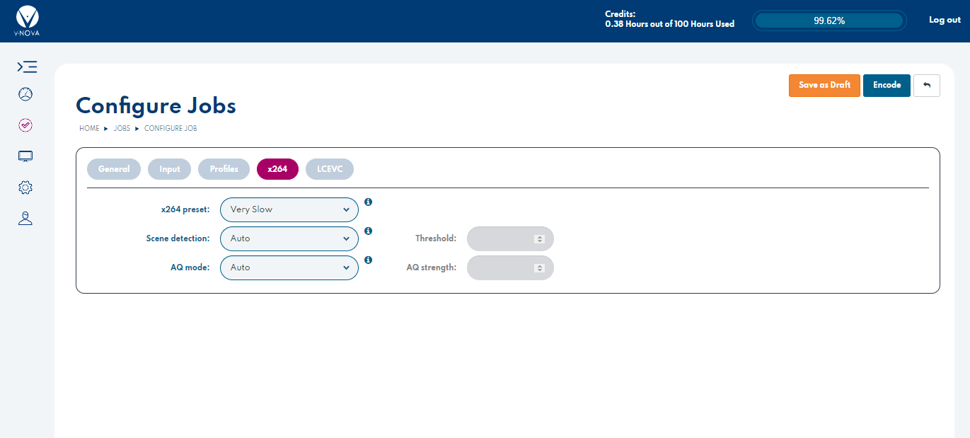 This tab is avaliable to accounts or users upon request. Parameters should be entered as if raw into a FFmpeg command line. LCEVC's EIL parameters must have ';' after each one, including the final.
